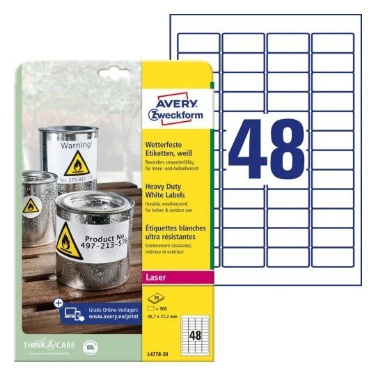 Etykiety Heavy Duty L4778-20 45,7 x 21,2 20ark Avery Zweckform, białe, poliestrowe