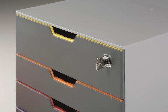 VARICOLOR pojemnik z kolorowymi szufladkami__ atrakcyjny i innowacyjny wzór__ kolorowe obramowanie szufladek ułatwia organizację dokumentów__ szufladki wyciągają się łatwo i stabilnie, posiadają ogranicznik blokujący _przed ich przypadkowym pełnym wyciągnięciem__ dostosowane do dokumentów A4 i C4__ w zestawie są nakładane indeksy z możliwością komputerowego opisania__ nóżki antypoślizgowe na spodzie pojemnika