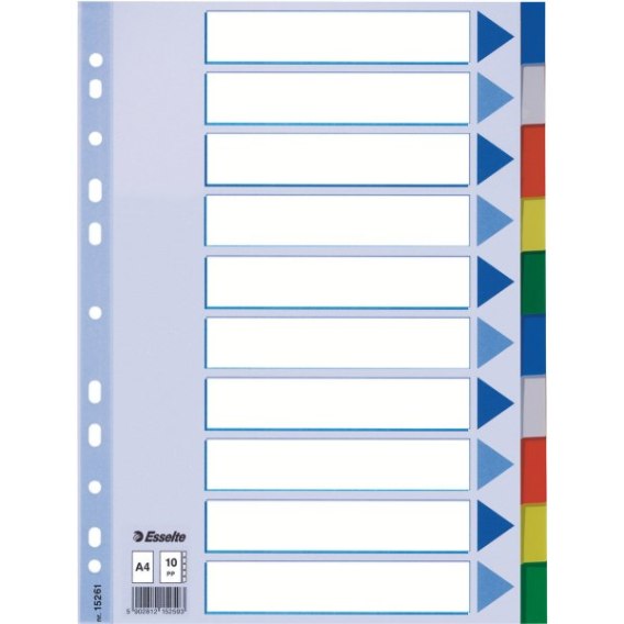 Przekładki A4 plastikowe PP Esselte_- numeryczne lub alfabetyczne_- multiperforowane - pasują do każdego segregatora_- z kartą informacyjno-opisową_- wymiar: 225 x 297 mm_- jednostka sprzedaży 1 komplet