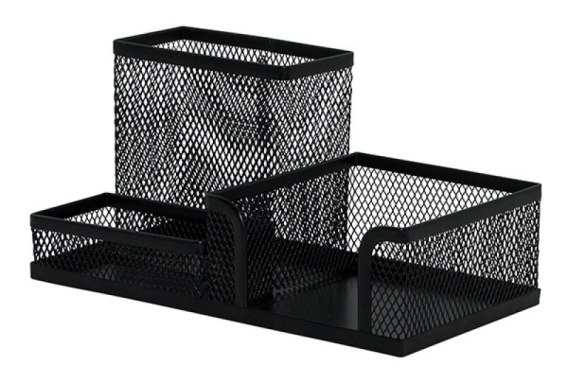Przybornik na biurko z metalowej siateczki powlekanej lakierem_1 komora na artykuły piśmienne_1 komora na drobne akcesoria biurowe (gumki, spinacze, itp.)_1 komora na karteczki_posiada gumowe nóżki_wymiary: 205x103x98mm_kolor czarny