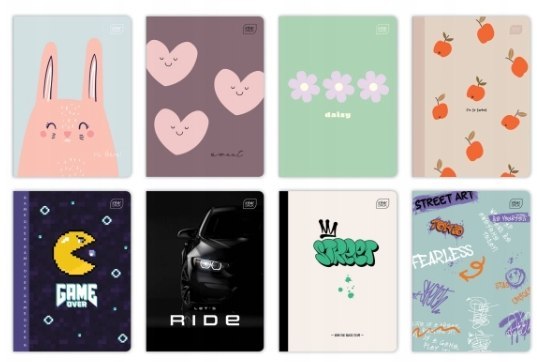 Zeszyt__okładka pokryta lakierem UV__zaokrąglone rogi (format A5)__bogata kolorystyka i duża_różnorodność wzorów okładek__jednostka sprzedaży 1 sztuka