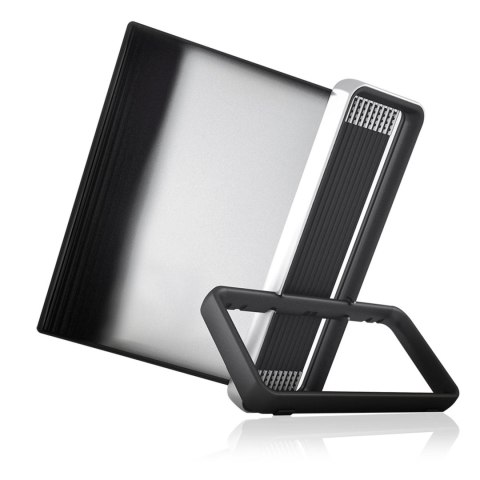 Nabiurkowy system prezentacyjny Djois x Tarifold w nowoczesnej serii Veo w rozmiarze A4 - idealny do każdego biura, hallu, recepcji czy sali spotkań. Wyjątkowy kształt i spektakularny design oraz wysoka jakość materiałów sprawiają, że jest to produkt nie tylko praktyczny, ale również elegancki. W skład zestawu wchodzi jedna lakierowana aluminiowa podstawa o podwyższonej stabilności, jedna lakierowana podstawa aluminiowa "miękka w dotyku" i 10 paneli prezentacyjnych otwieranych z góry w kolorze czarnym. System pozwala w łatwy sposób zapewnić szybki dostęp do wszystkich ważnych informacji w miejscach, gdzie są potrzebne. Istnieje możliwość rozbudowy poprzez dodanie systemu naściennego VEO do systemu nabiurkowego. Model zawiera komplet paneli prezentacyjnych, wykonanych według opatentowanej francuskiej technologii, zapewniając niezrównany poziom jakości i wytrzymałości. Specjalny stalowy drut powoduje, że panele są bardzo elastyczne i zarazem odporne na wszelkiego rodzaju zgięcia. Kolorowa ramka ułatwia identyfikację i prezentację dokumentów. Matowy, antyodblaskowy i przyjazny dla środowiska materiał 110 µ eliminuje refleksy świetlne, ułatwiając czytanie nawet przy bezpośrednio padającym świetle. Panele utrzymywane są pod odpowiednim kątem, by dostęp do informacji był jeszcze łatwiejszy i wygodniejszy.
