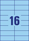 Technologia druku:•INK JET: Tak•LASER: Tak•LASER COLOR: Tak•KSERO: TakCechy produktu:•Rozmiar etykiety (mm): 105 x 37•Etykiet / arkusz: 16•Arkuszy/ opakowanie: 100•Etykiet/ opakowanie: 1600•Kolor: niebieskie•Format: A4•Rzędów/ arkusz: 2x8•Certyfikaty: FSC