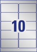 Technologia druku:•LASER: TakCechy produktu:•Rozmiar etykiety (mm): 96 x 50,8•Etykiet / arkusz: 10•Arkuszy/ opakowanie: 20•Etykiet/ opakowanie: 200•Kolor: srebrne•Format: A4•Rzędów/ arkusz: 2x5