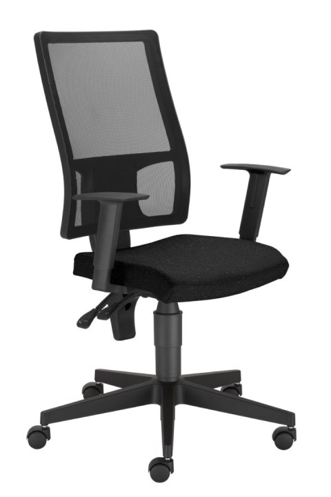 Kółka do powierzchni dywanowych w standardzie._Miękkie, tapicerowane siedzisko._Oparcie z wysokogatunkowej siatki._Podstawa: czarna, nylonowa._Regulowana wysokość krzesła._Regulowana wysokość oparcia za pomocą śruby.