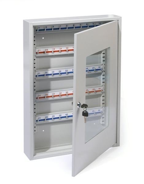 Metalowa szafka na klucze ze szklanymi drzwiczkami_kolor jasnopopielaty_50 miejsc na klucze_zamek cylindryczny_w komplecie 60 zawieszek do kluczy_wymiary: 550 x 380x 80 mm