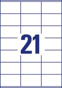 Technologia druku:•INK JET: Tak•LASER: Tak•LASER COLOR: Tak•KSERO: TakCechy produktu:•Rozmiar etykiety (mm): 70 x 41•Etykiet / arkusz: 21•Arkuszy/ opakowanie: 100•Etykiet/ opakowanie: 2100•Kolor: białe•Format: A4•Rzędów/ arkusz: 3x7•Certyfikaty: FSC
