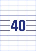 Technologia druku:•INK JET: Tak•LASER: Tak•LASER COLOR: Tak•KSERO: TakCechy produktu:•Rozmiar etykiety (mm): 52,5 x 29,7•Etykiet / arkusz: 40•Arkuszy/ opakowanie: 100•Etykiet/ opakowanie: 4000•Kolor: białe•Format: A4•Rzędów/ arkusz: 4x10•Certyfikaty: FSC