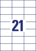 Technologia druku:•INK JET: Tak•LASER: Tak•LASER COLOR: Tak•KSERO: TakCechy produktu:•Rozmiar etykiety (mm): 70 x 42,3•Etykiet / arkusz: 21•Arkuszy/ opakowanie: 100•Etykiet/ opakowanie: 2100•Kolor: białe•Format: A4•Rzędów/ arkusz: 3x7•Certyfikaty: FSC