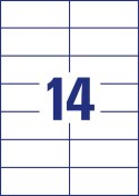 Technologia druku:•INK JET: Tak•LASER: Tak•LASER COLOR: Tak•KSERO: TakCechy produktu:•Rozmiar etykiety (mm): 105 x 42,3•Etykiet / arkusz: 14•Arkuszy/ opakowanie: 100•Etykiet/ opakowanie: 1400•Kolor: białe•Format: A4•Rzędów/ arkusz: 2x7•Certyfikaty: FSC