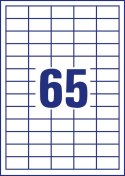 Technologia druku:•INK JET: Tak•LASER: Tak•LASER COLOR: Tak•KSERO: TakCechy produktu:•Rozmiar etykiety (mm): 38 x 21,2•Etykiet / arkusz: 65•Arkuszy/ opakowanie: 100•Etykiet/ opakowanie: 6500•Kolor: białe•Format: A4•Rzędów/ arkusz: 5x13•Certyfikaty: FSC